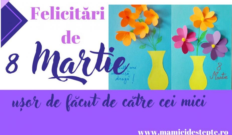 8 Martie se apropie! Copiii își pot face mămicile să se simtă speciale oferindu-le felicitari făcute chiar de mânuțele lor. Pentru fiecare din aceste felicitări de 8 Martie veți folosi doar lucruri pe care cel mai probabil le aveți deja în casă – hârtie colorată (noi am cumparat-o de aici), foarfece și lipici. Sunt ușor de făcut de către copiii, fie independent, fie cu puțin ajutor pentru cei mai mici.